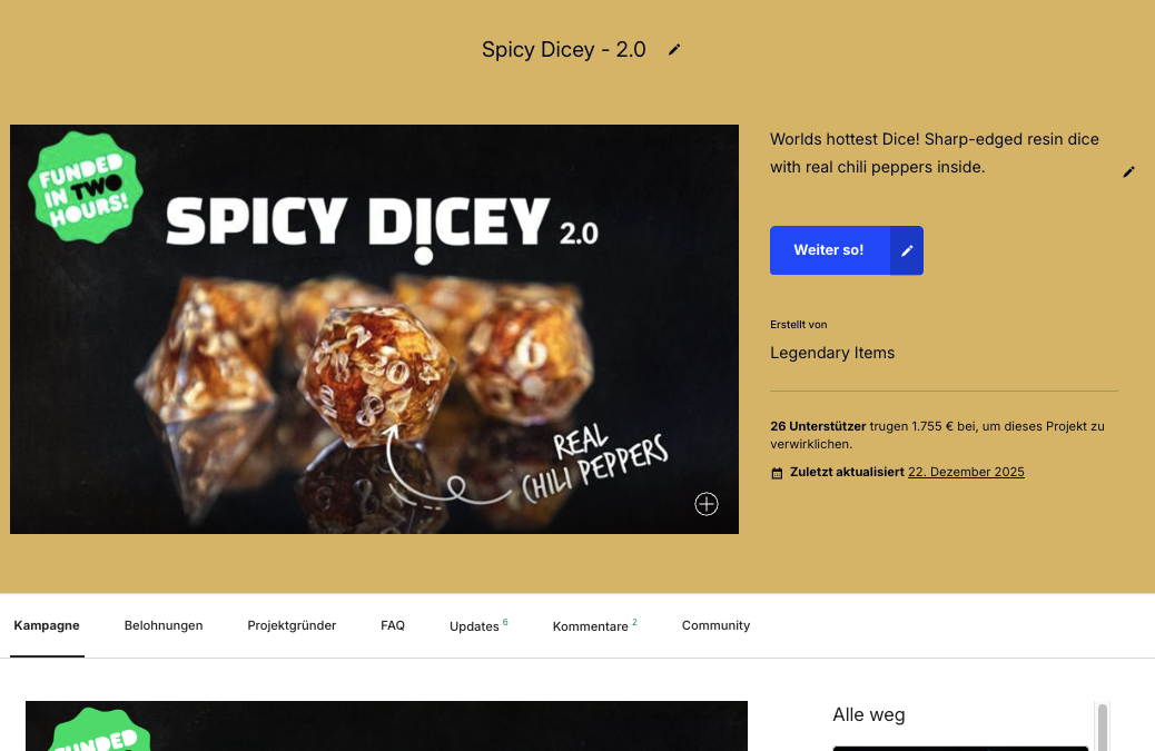 Dank euch konnten wir 1.755 € in nur 9 Tagen finanzieren und eine eigentlich riskante Follow-Up-Idee in einen echten Erfolg verwandeln.