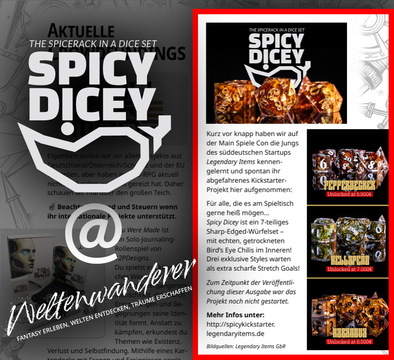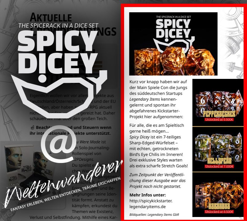 Unsere neuen Freunde vom Weltenwanderer Magazin haben Spicy Dicey ganz spontan in ihre aktuelle Ausgabe aufgenommen. 🎉 Unsere Kickstarter-Kampagne zu Spicy Dicey startet am 25. Oktober […]