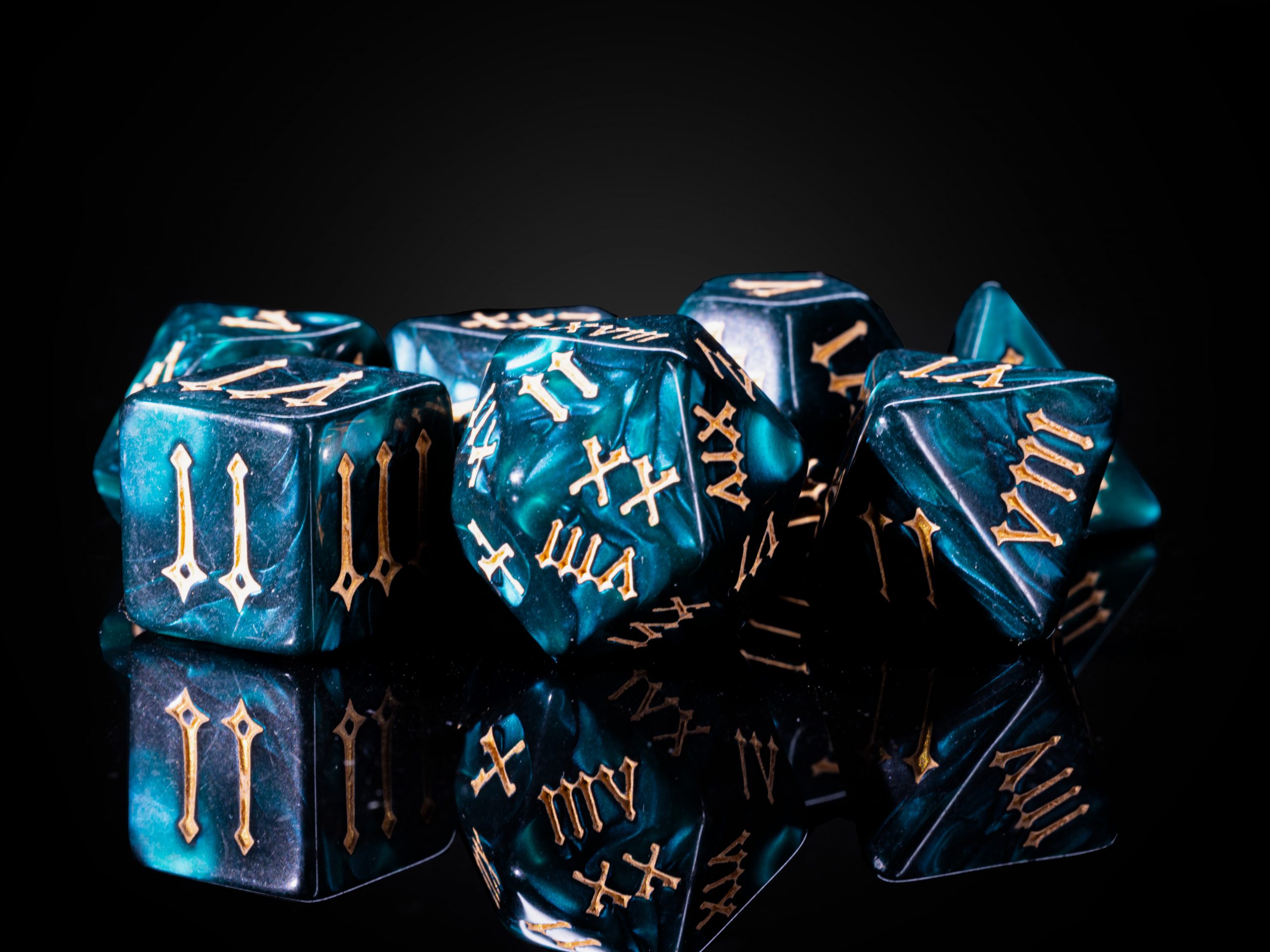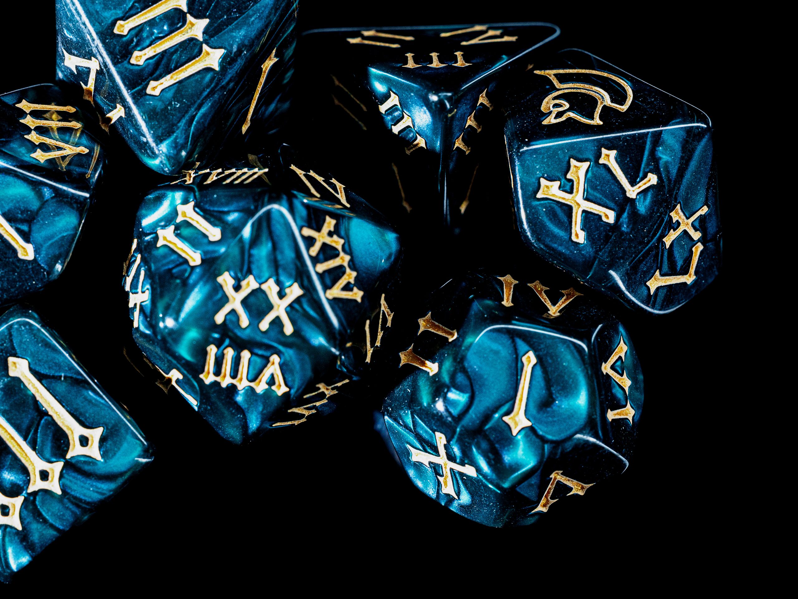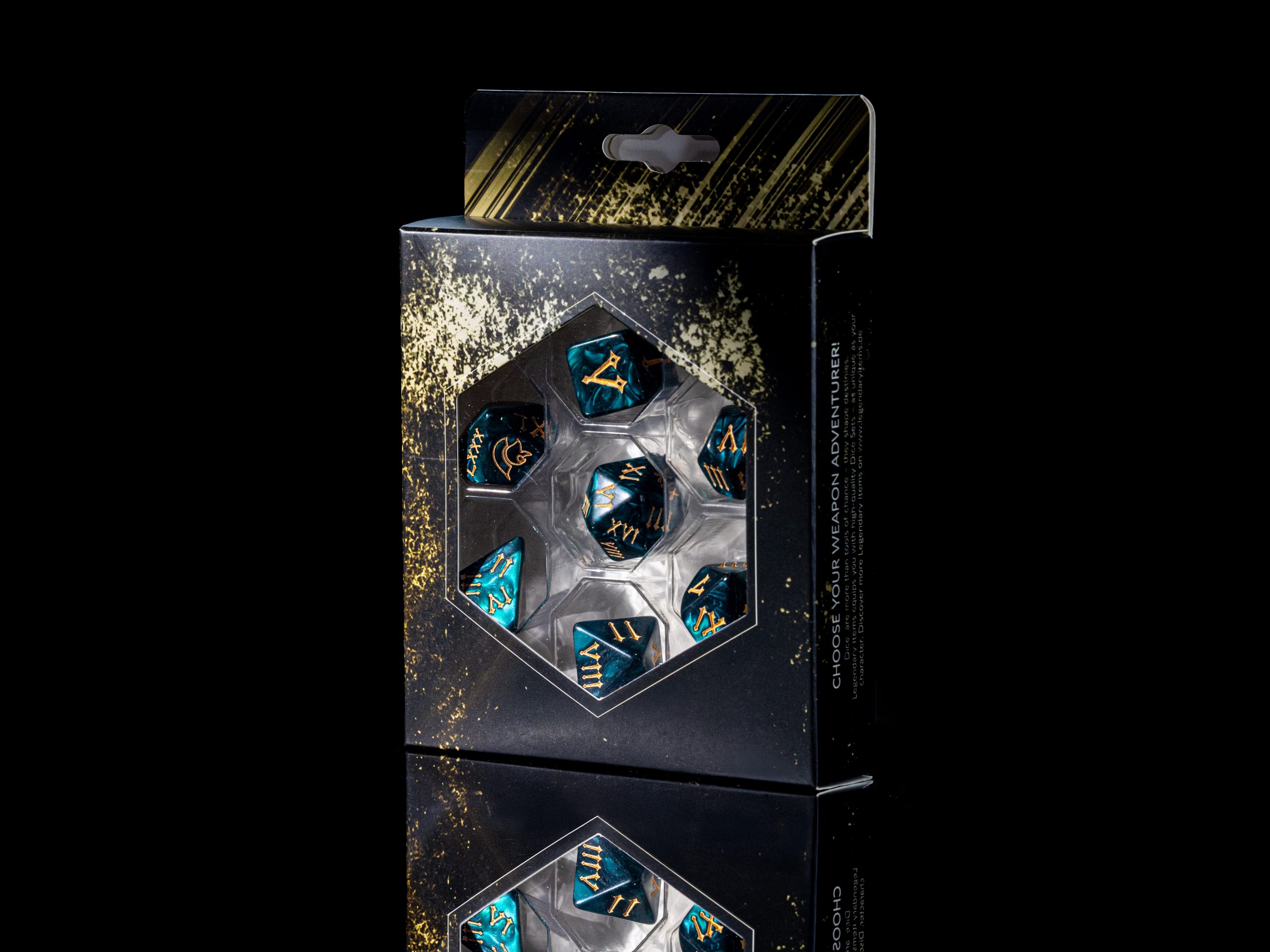 Lieferumfang: 7-teiliges Würfelset mit Standard-W4 im Legendary-Kartonschuber