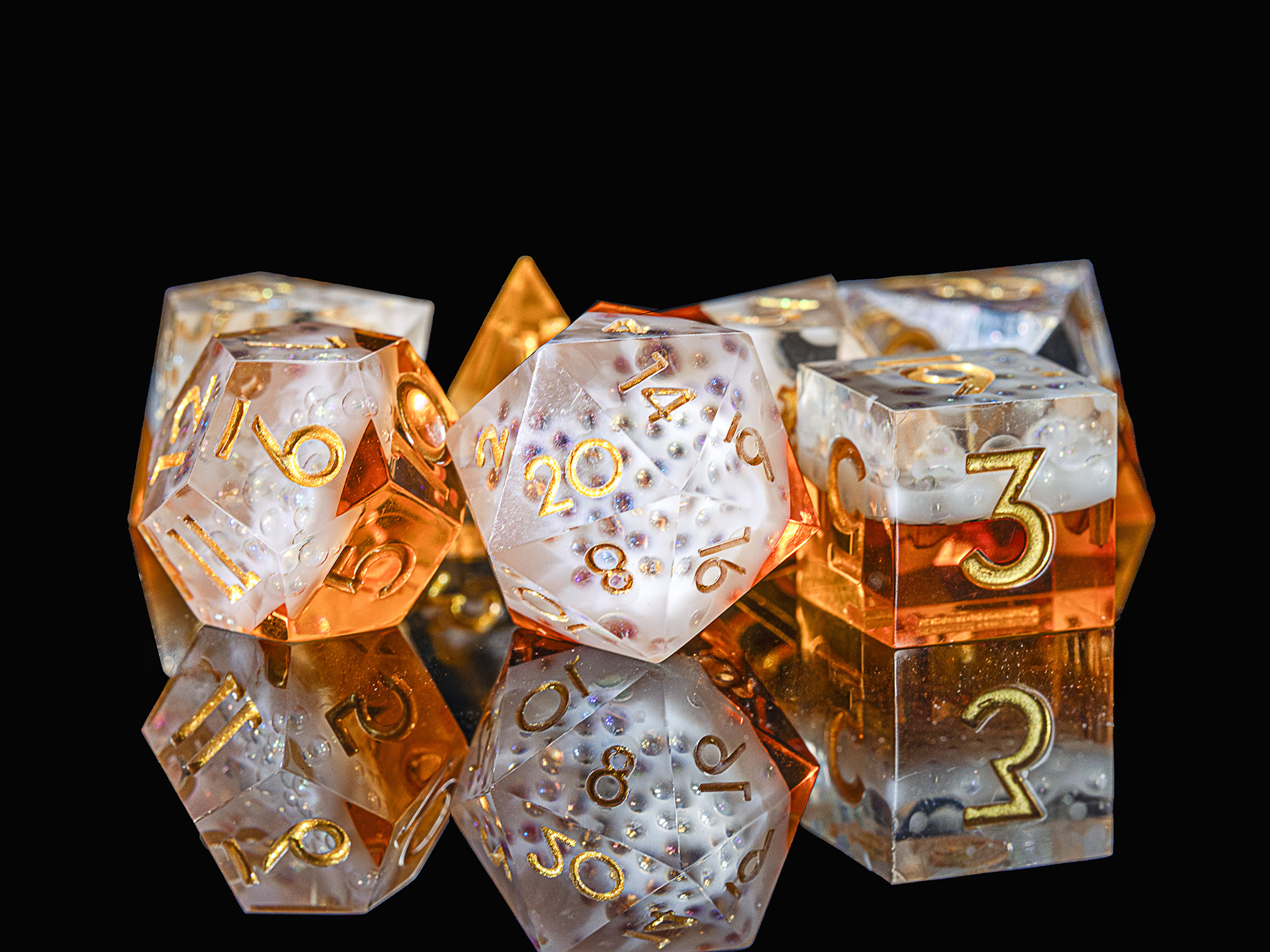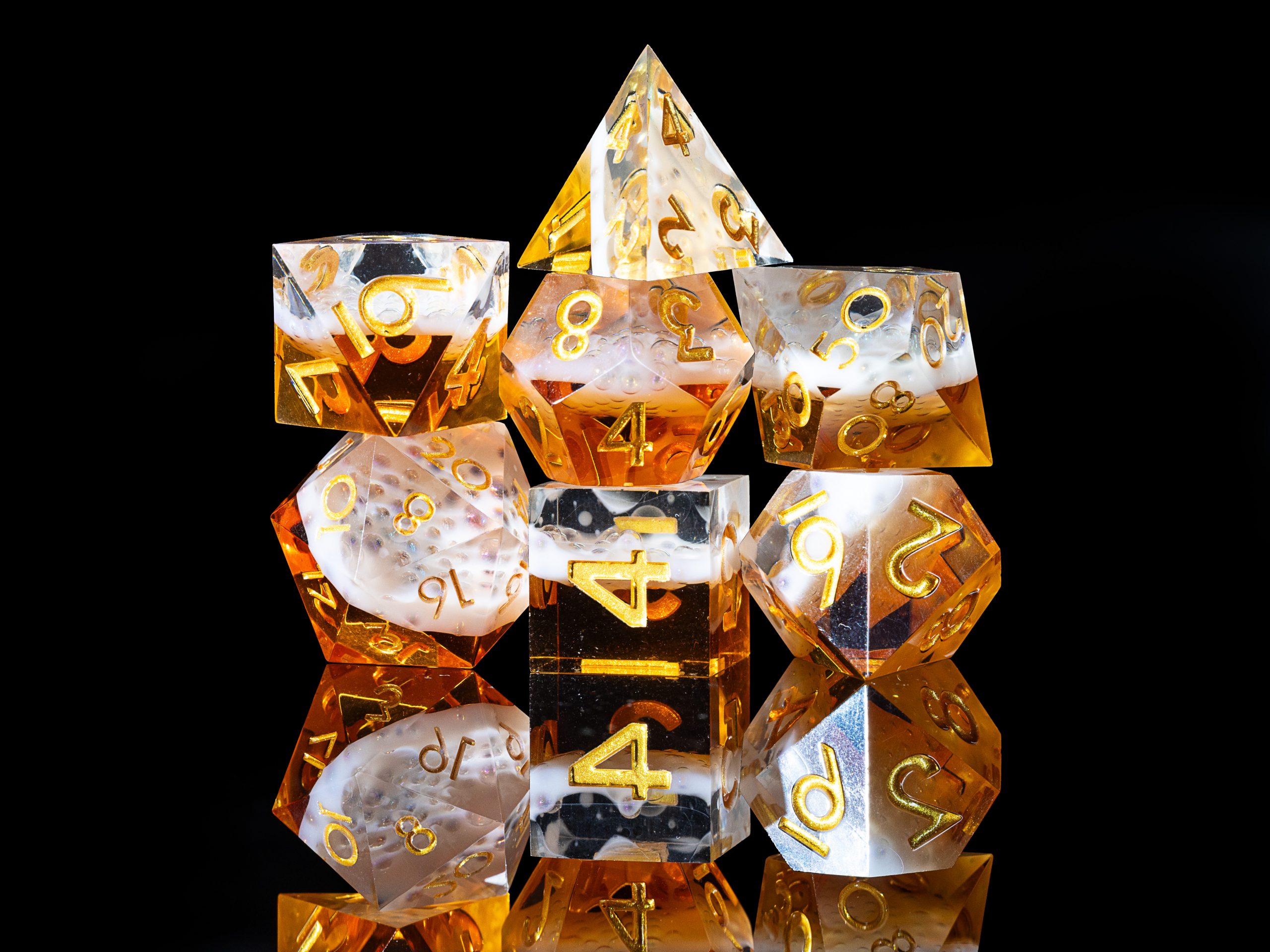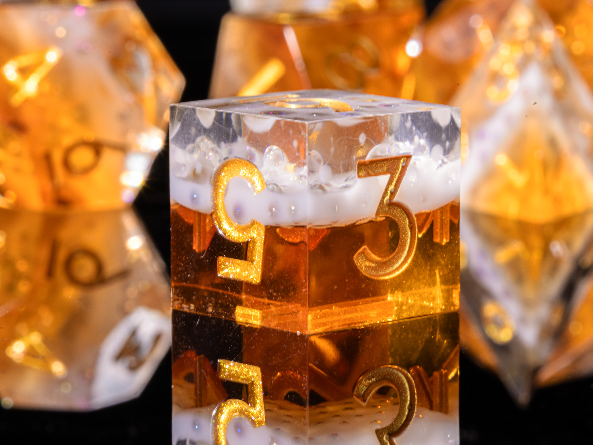 Unsere Beer Dice sind scharfkantige Resinwürfel im Look eines frisch eingeschenkten Biers. Der untere Teil der Würfel zeigt goldenes Bier, gekrönt von einer weißen Schaumkrone, während die schnörkellose, goldfarbene Beschriftung für klare Lesbarkeit sorgt.