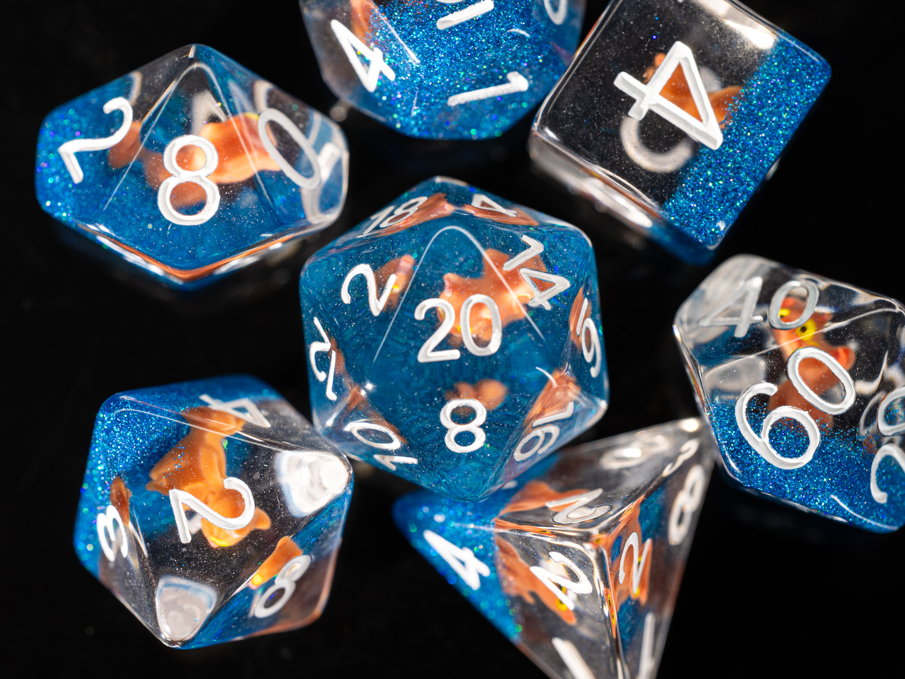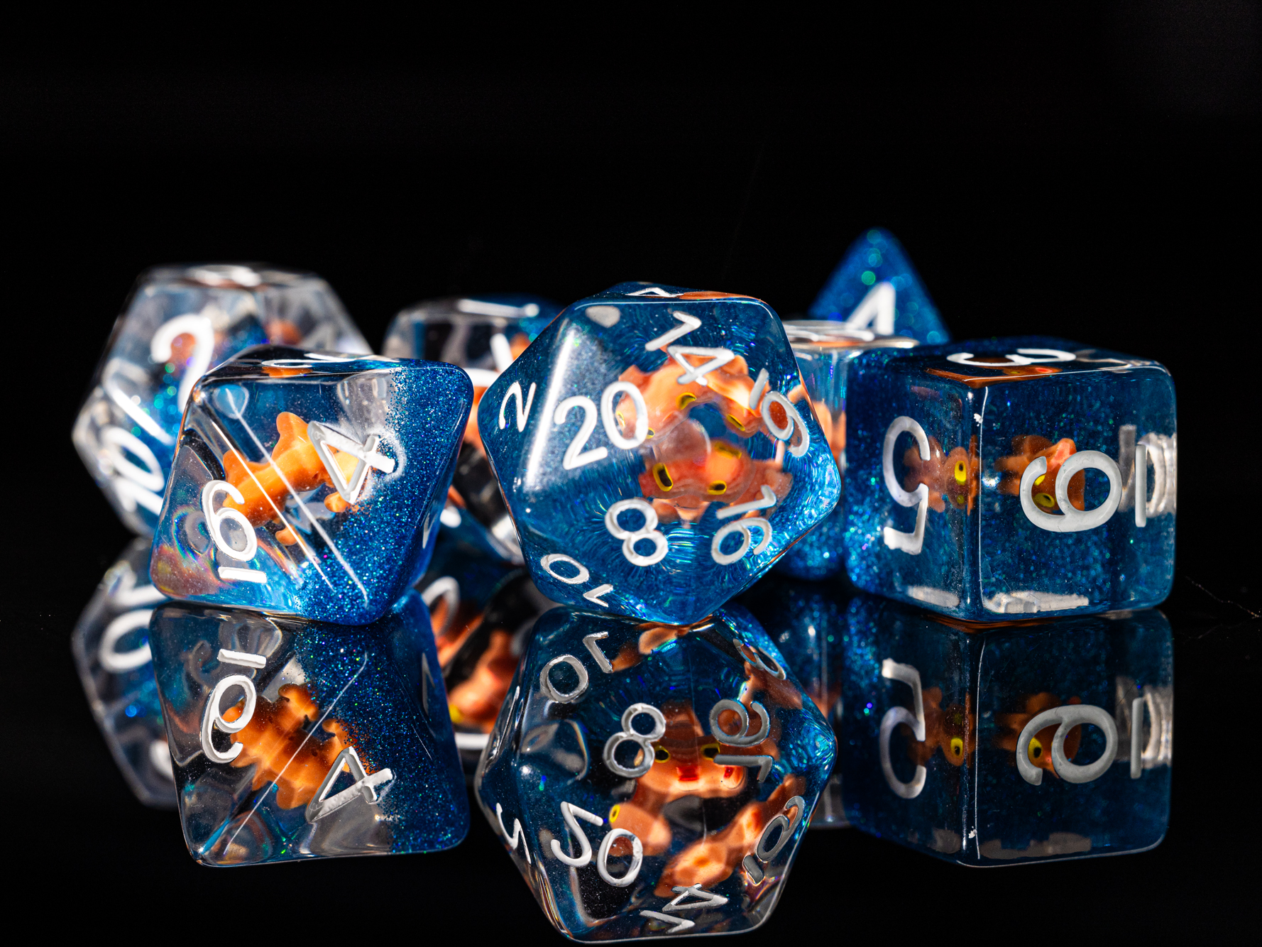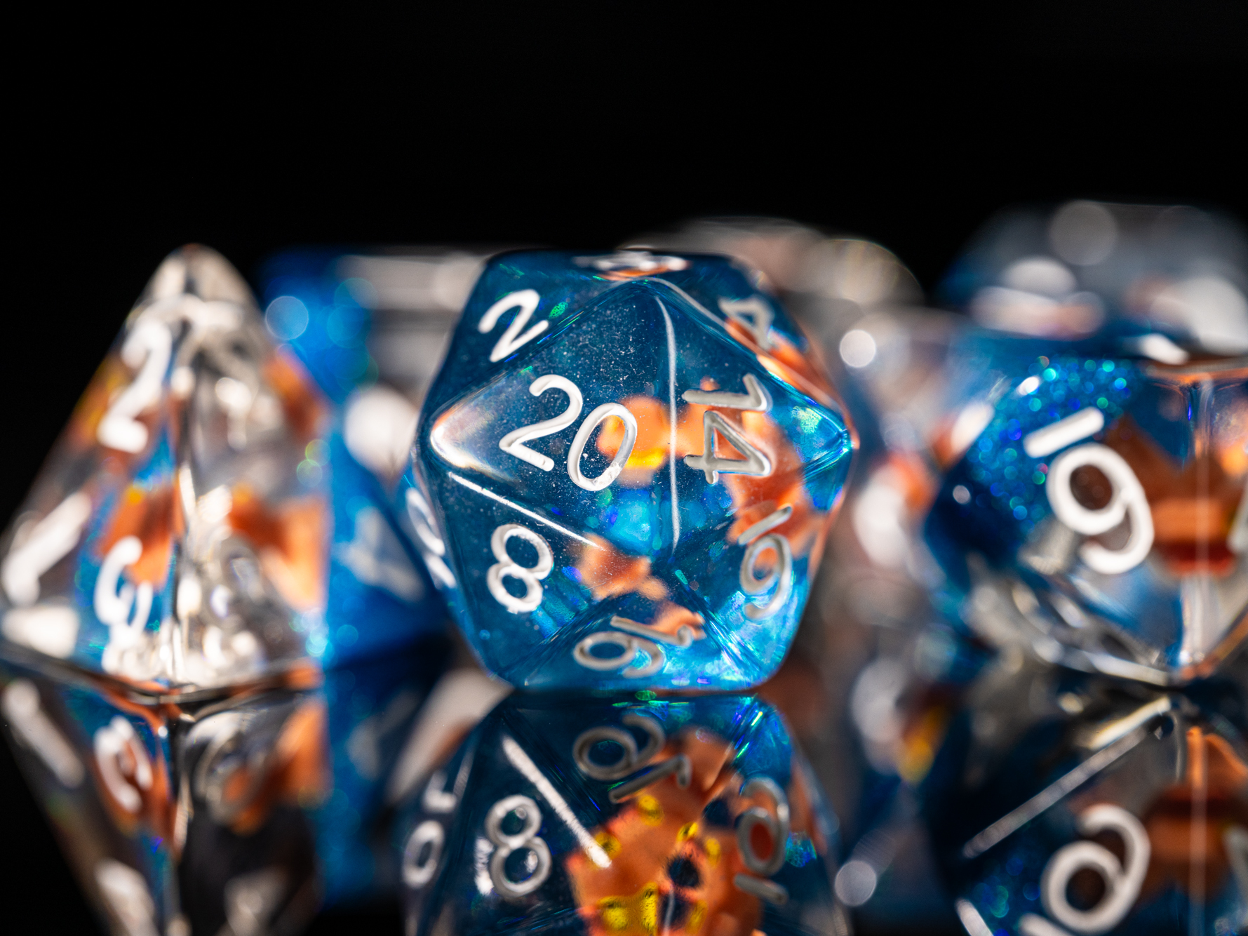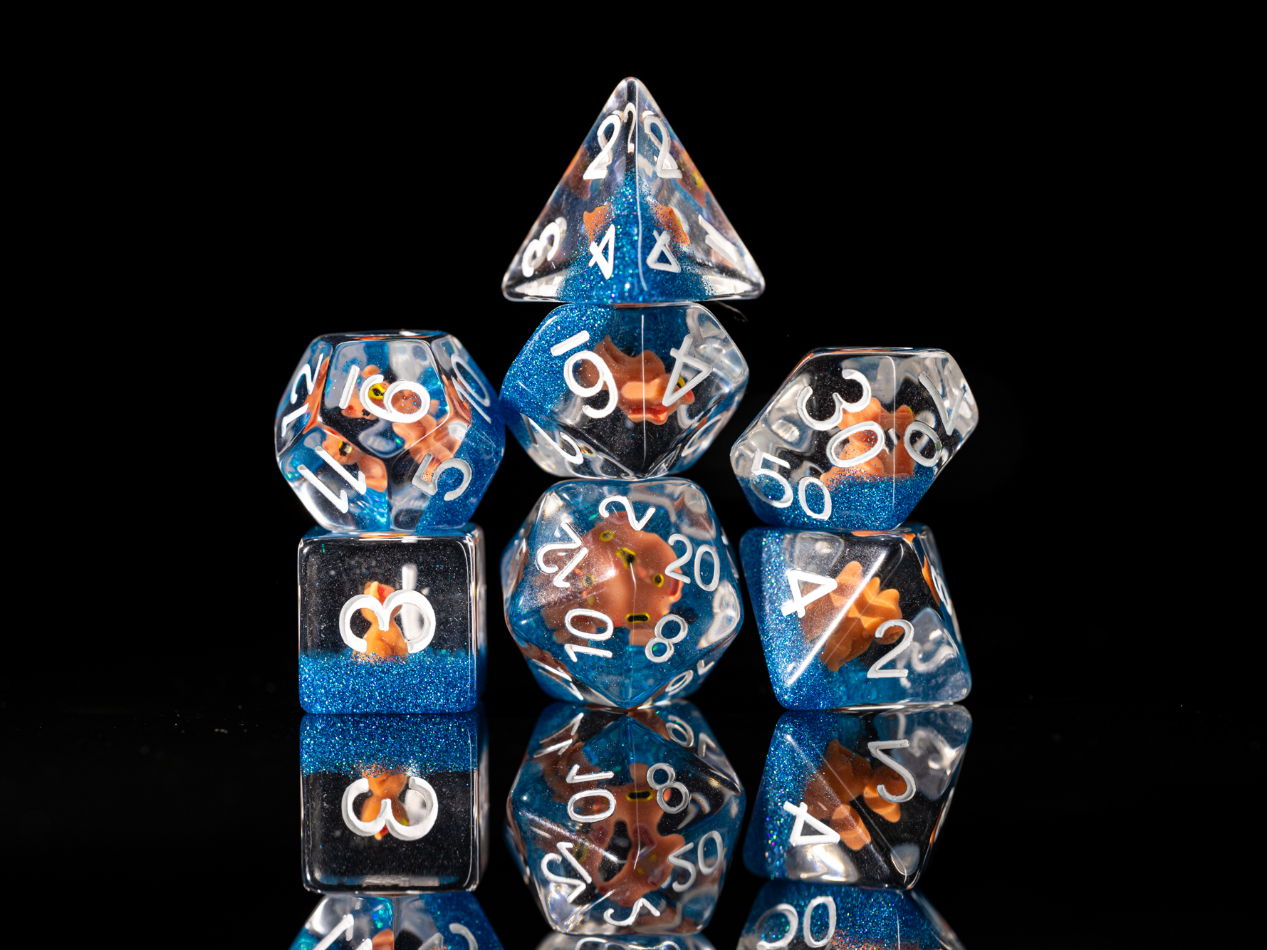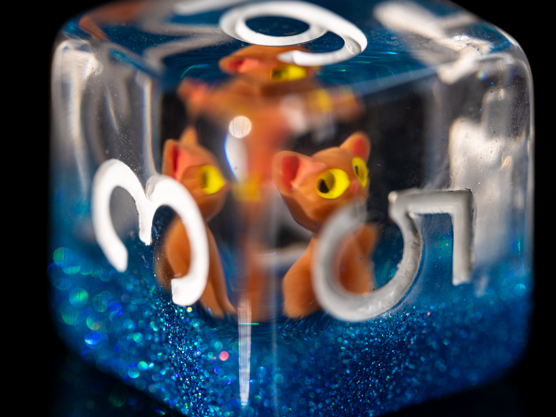 Unsere Furry Rogue Würfel sind ein absolutes Highlight für alle Katzenfans und Sammler ausgefallener Sets. In jedem transparenten Acrylwürfel sitzt ein kleines braunes Kätzchen, das es sich auf einem funkelnden Glitzerboden in passendem Blauton gemütlich gemacht hat.