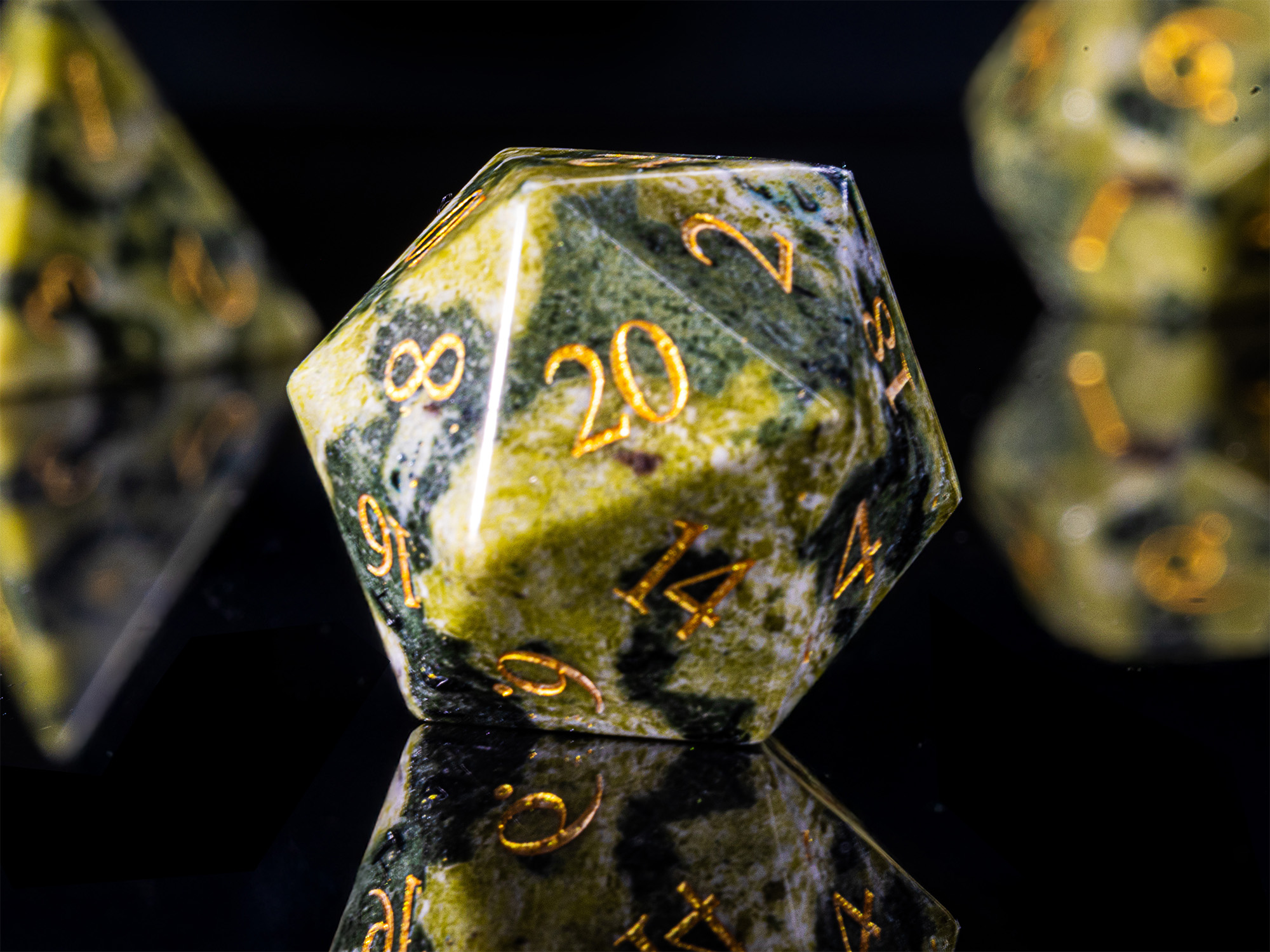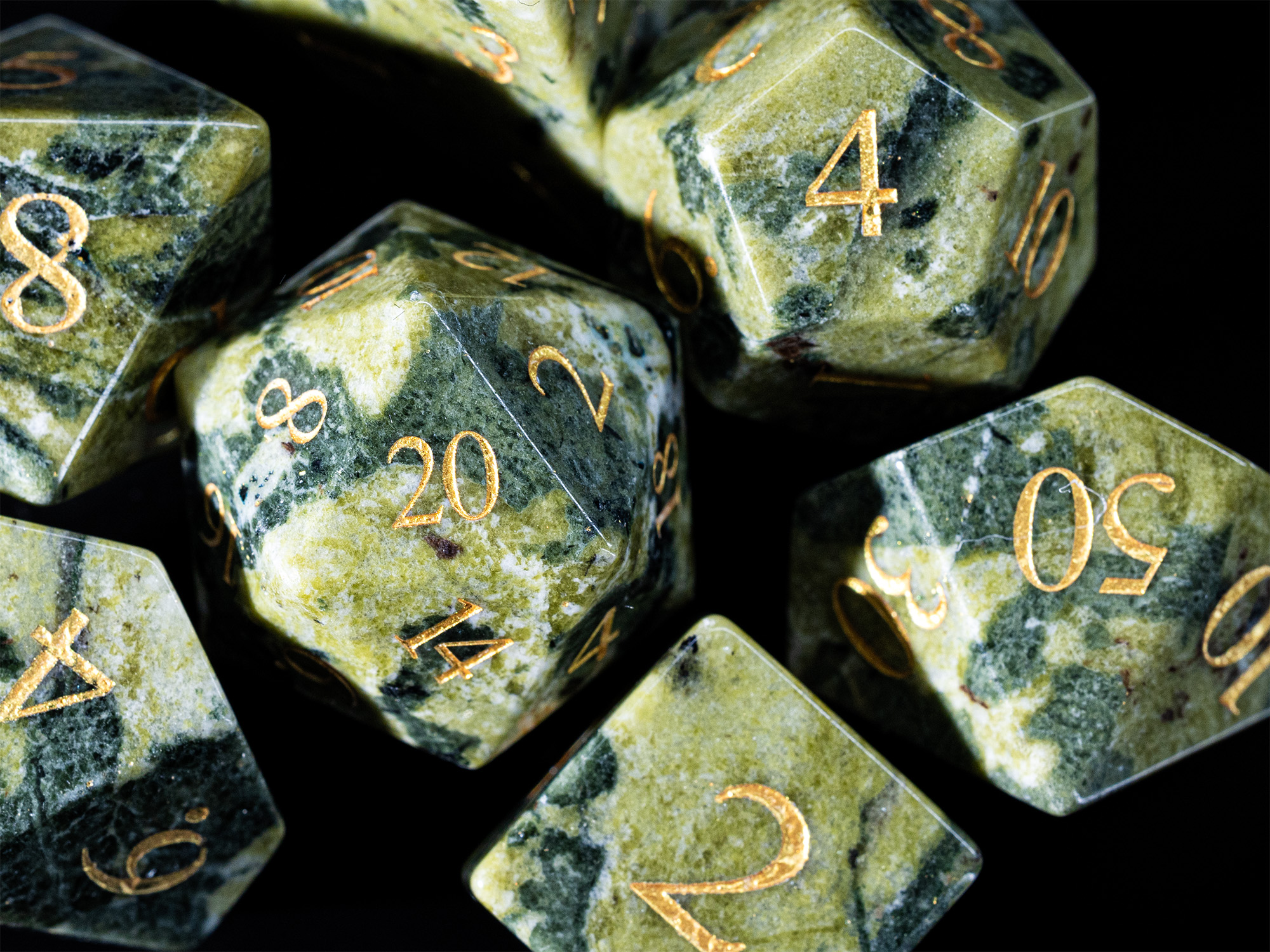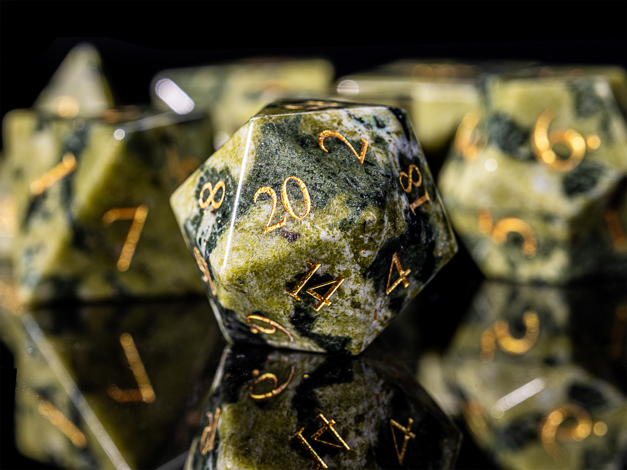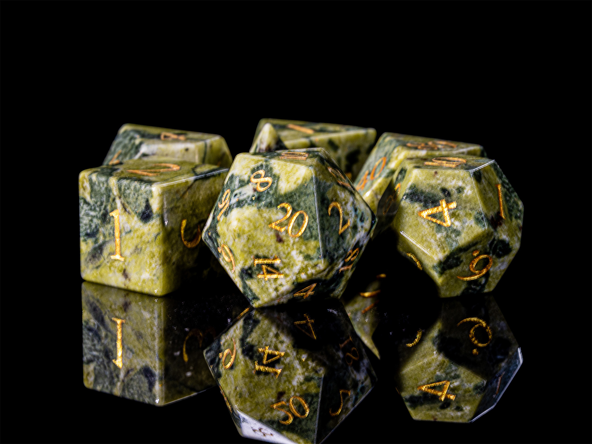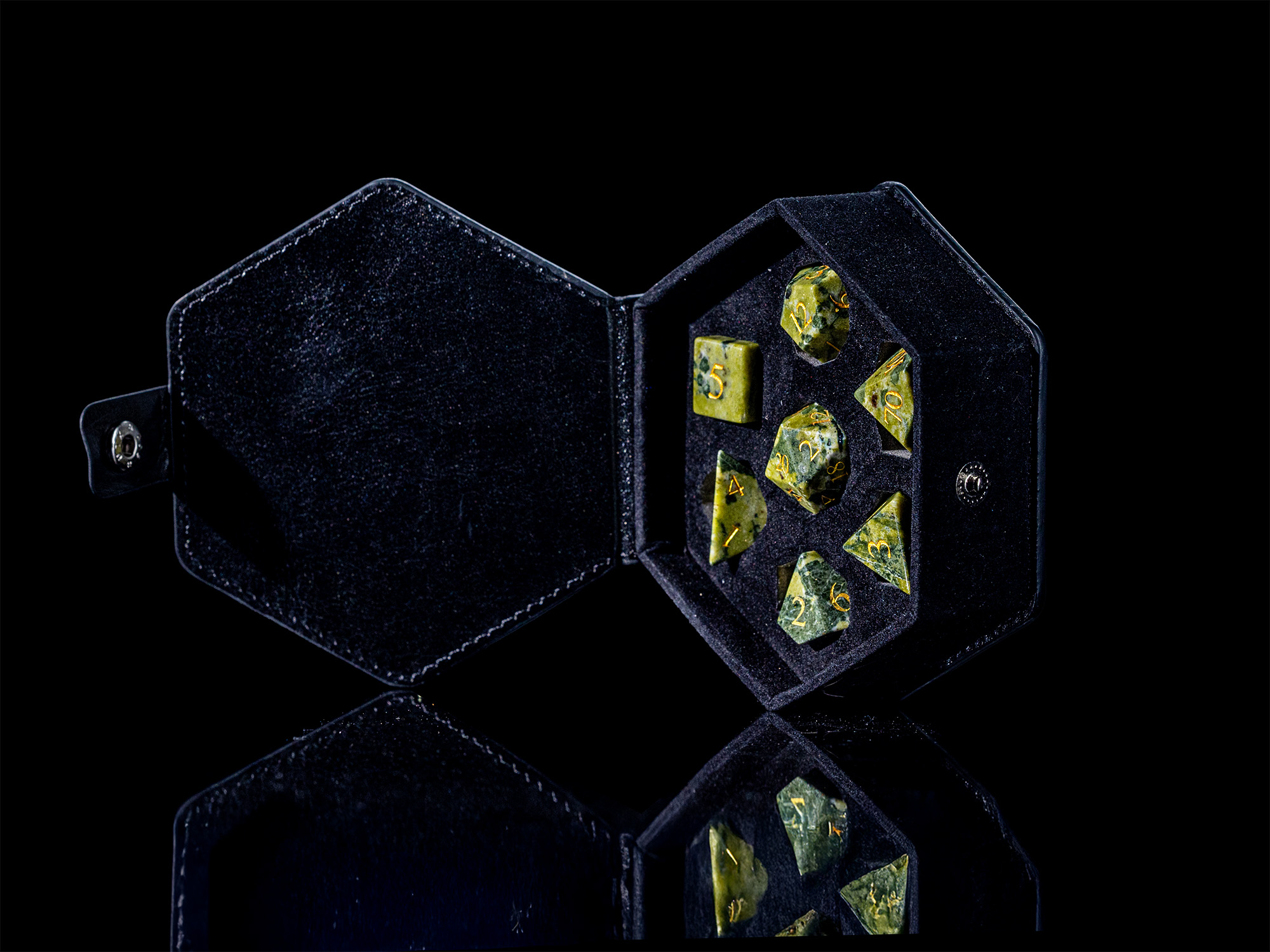 Lieferumfang: 7-teiliges Würfelset (inkl. Kristall-D4) in schwarzer Kunstlederbox