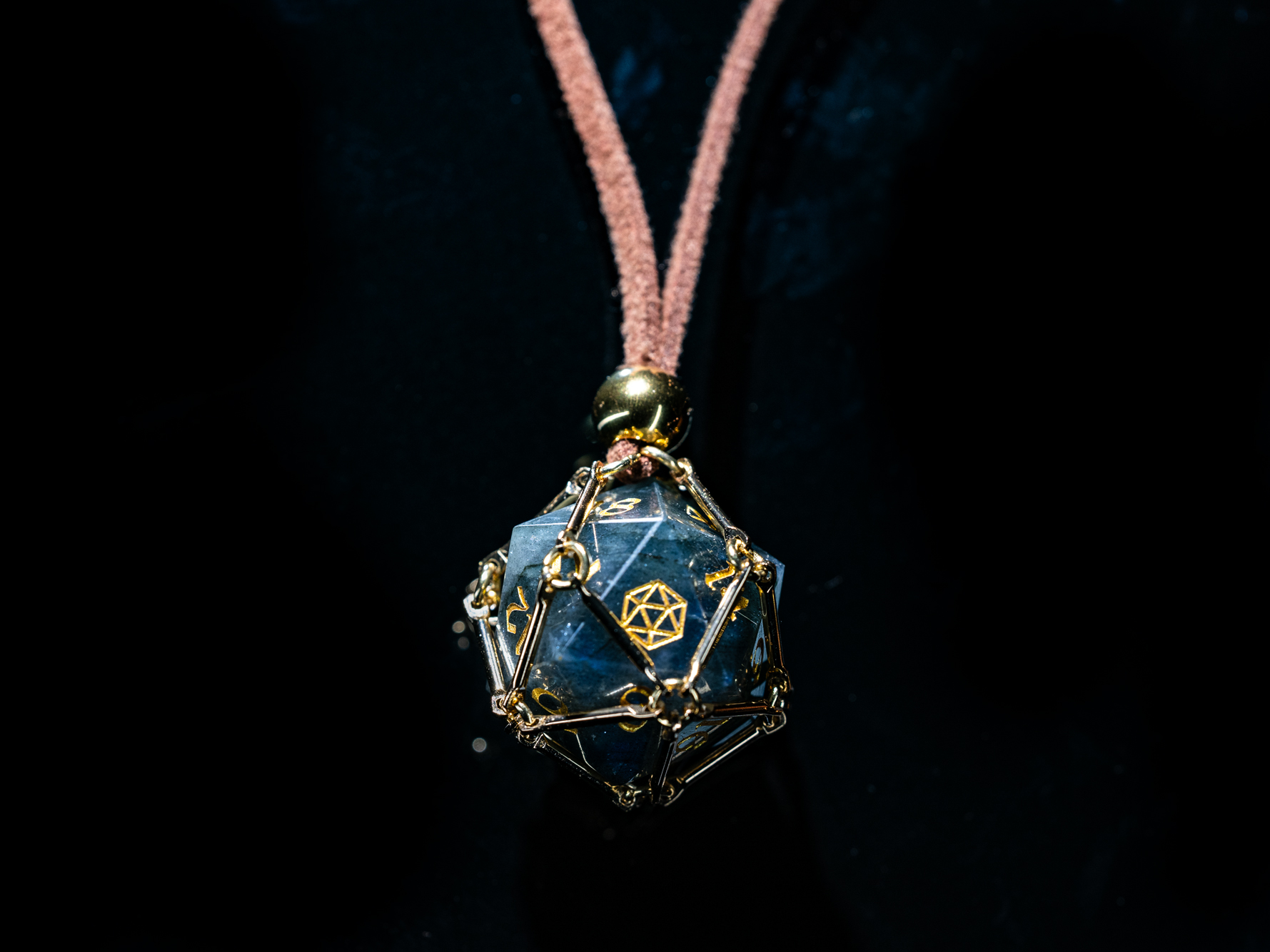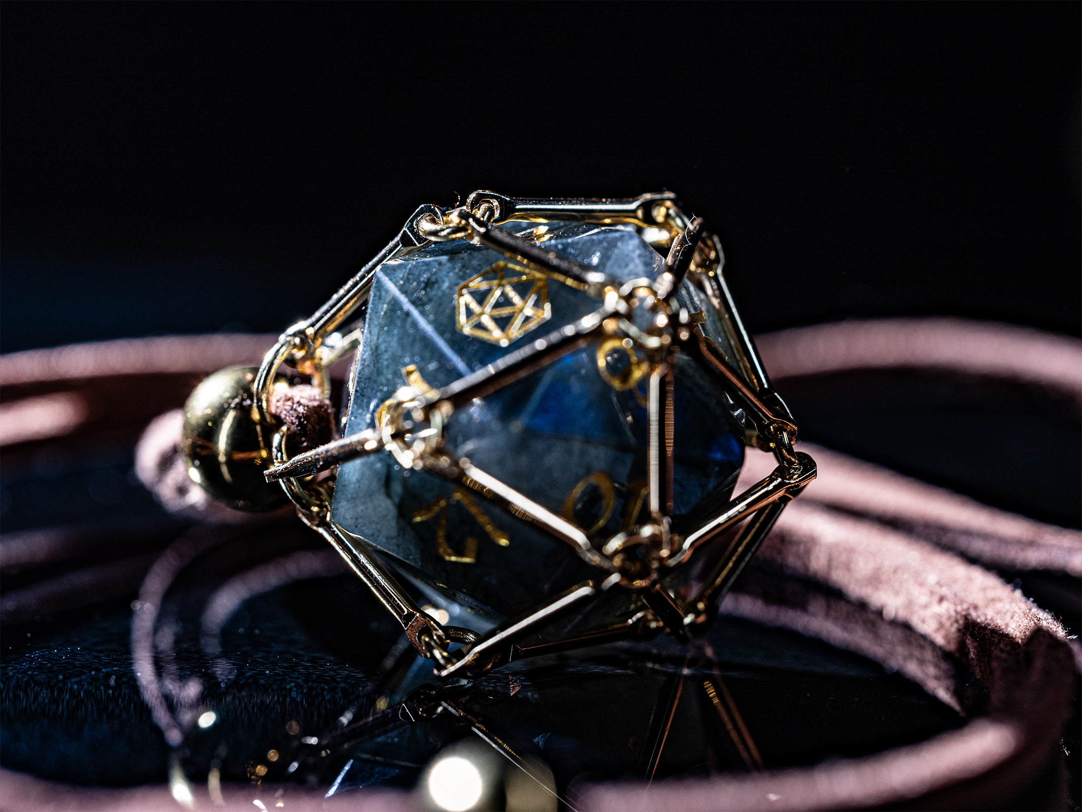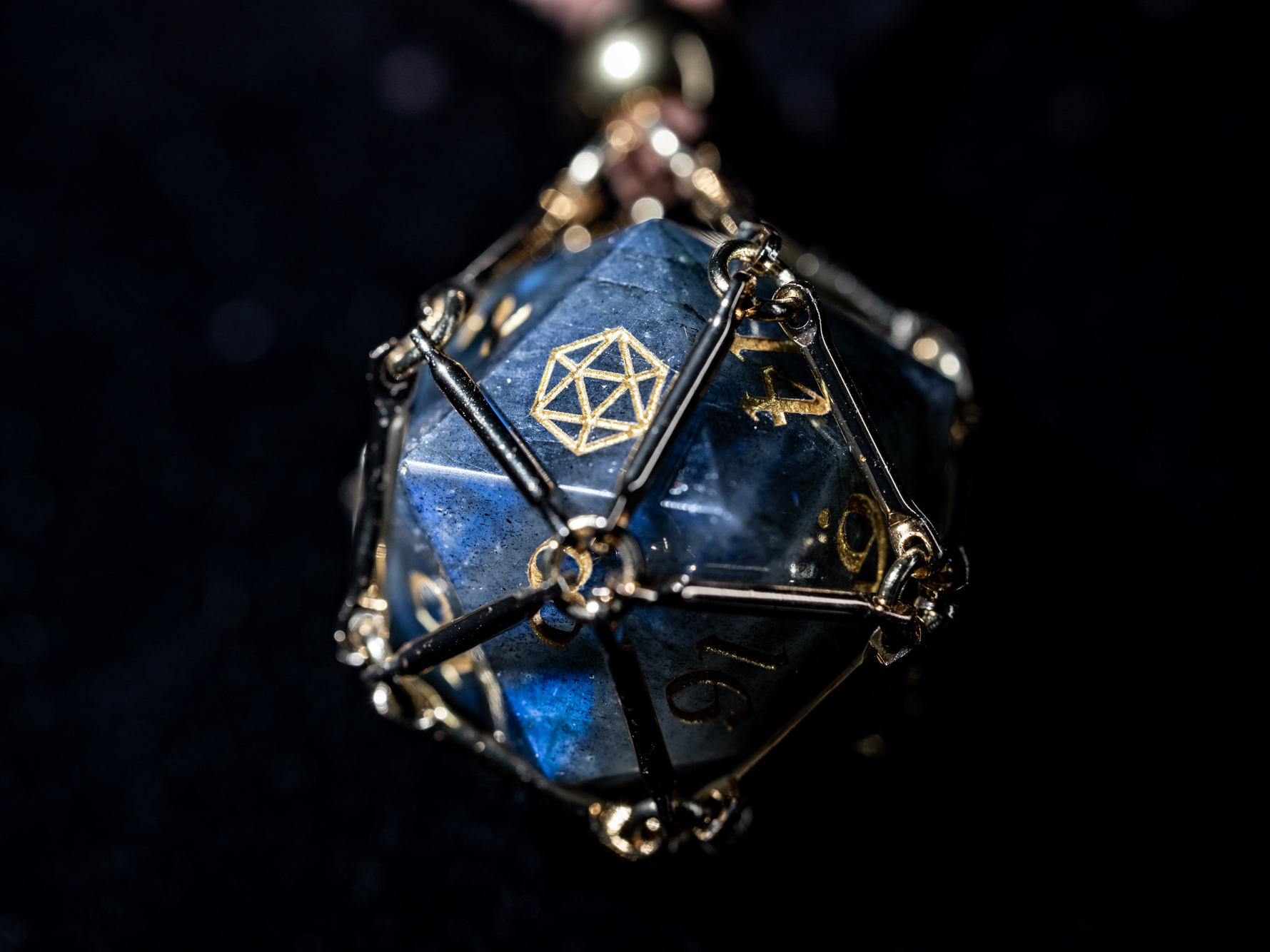 Saga – Moonlight Path ist ein vergoldeter Würfelkäfig, der einen schimmernden Labradorit-D20 beherbergt.