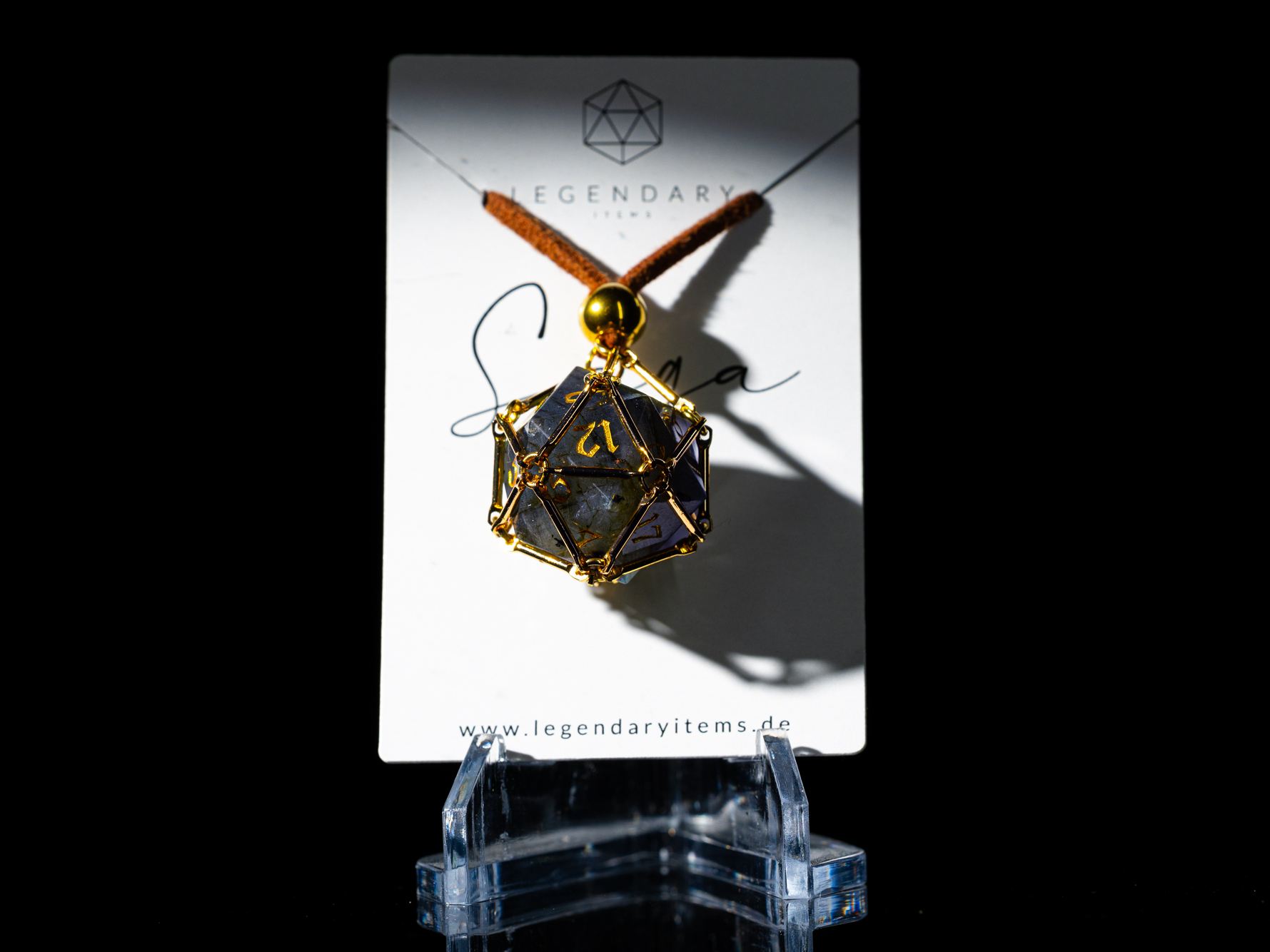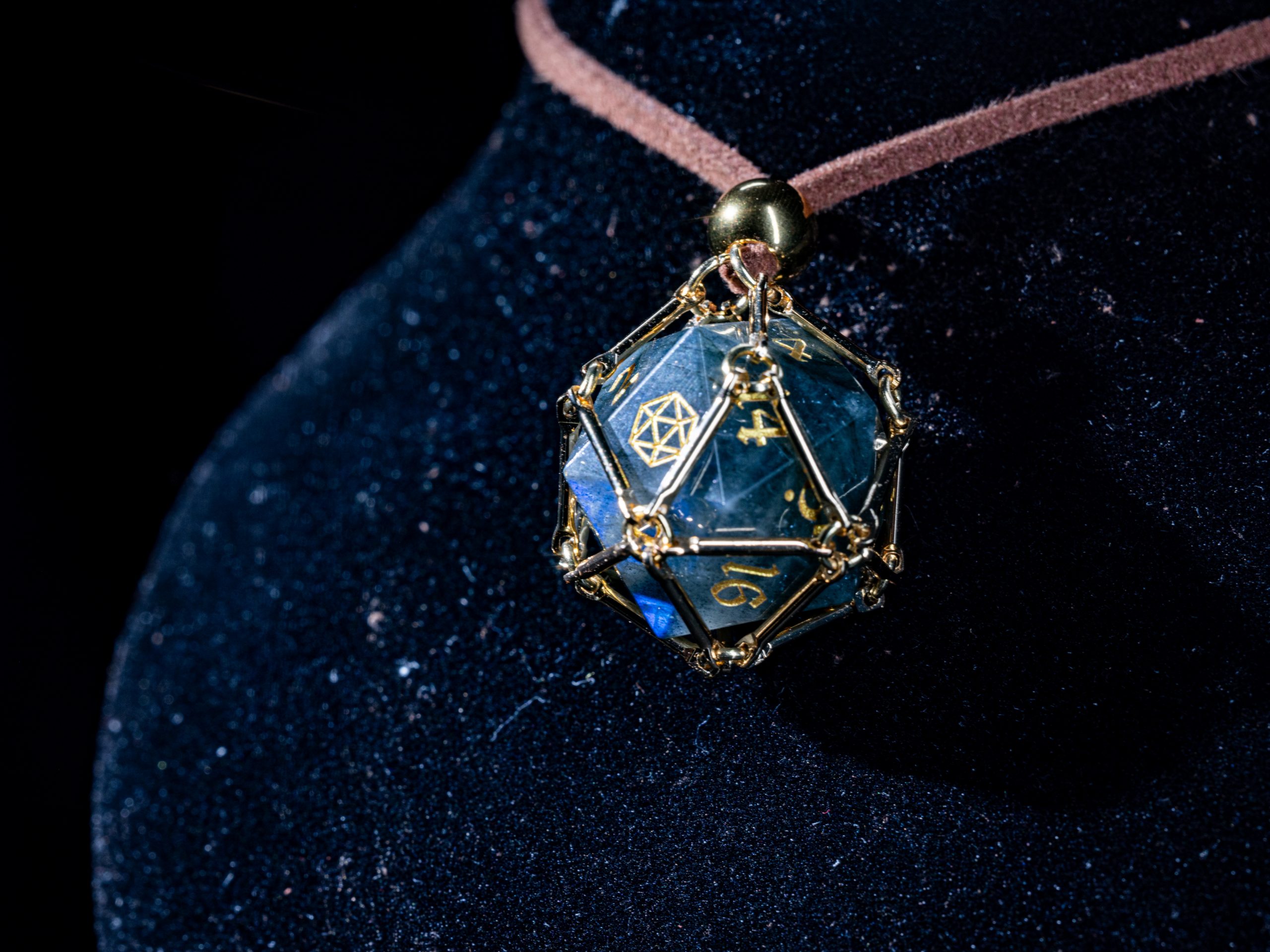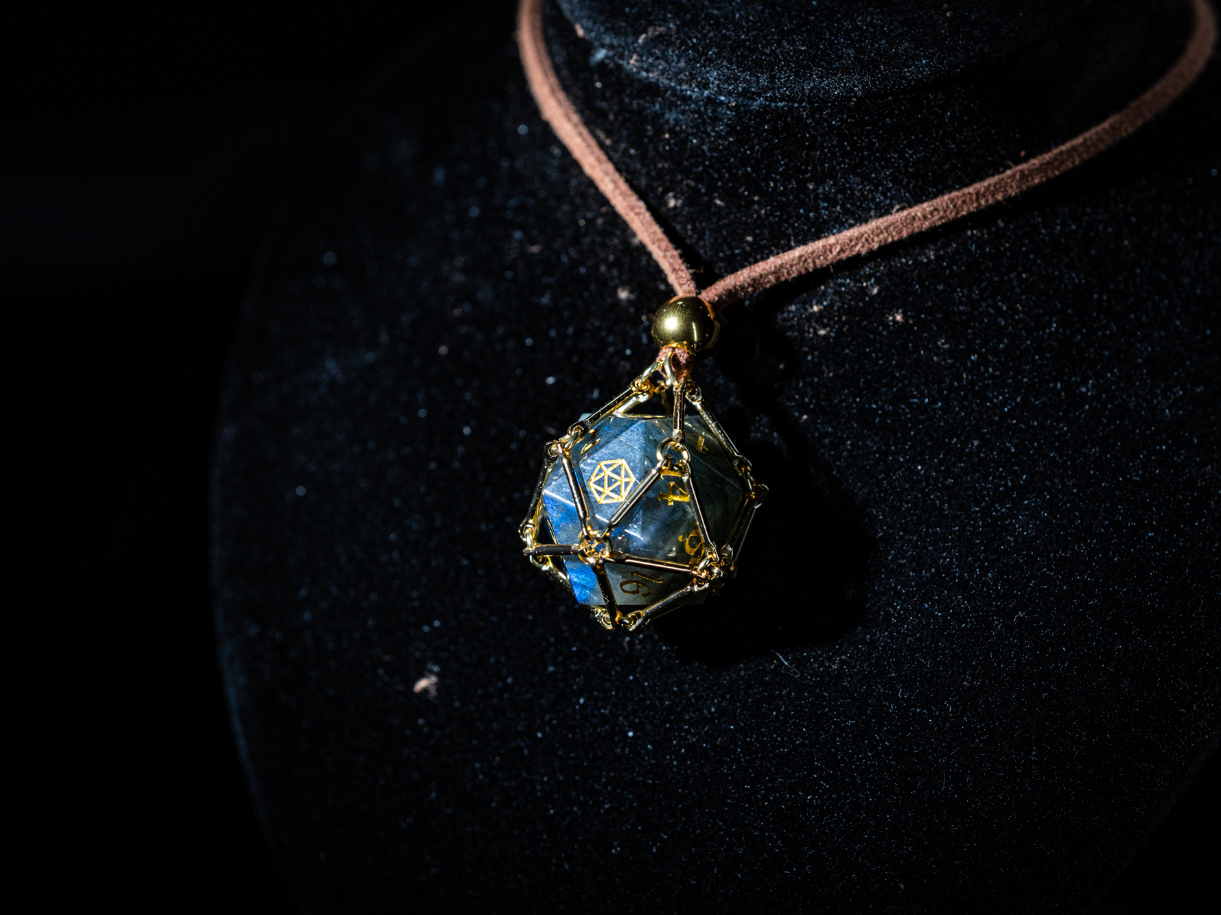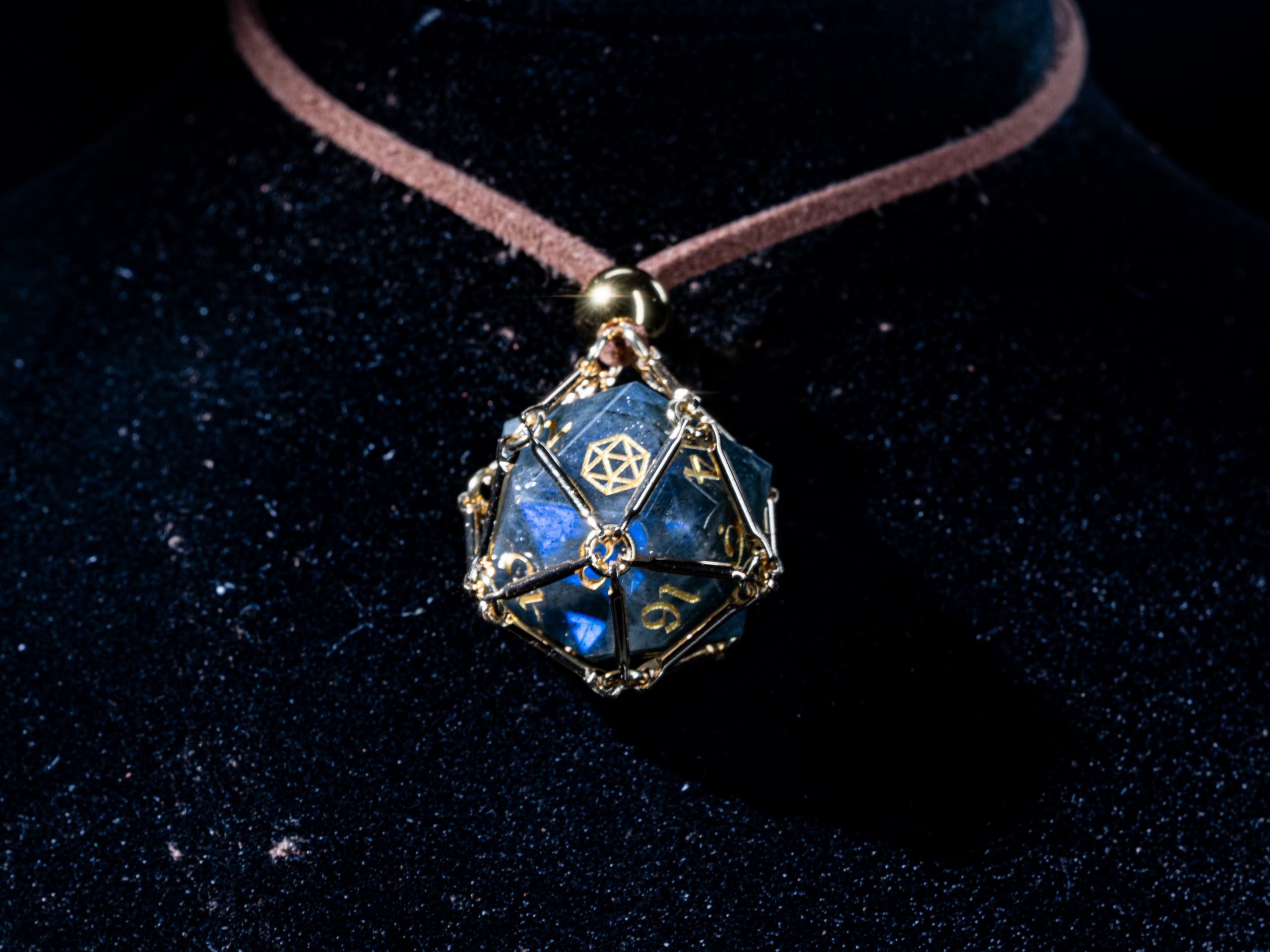 Saga – Moonlight Path ist ein vergoldeter Würfelkäfig, der einen schimmernden Labradorit-D20 beherbergt.