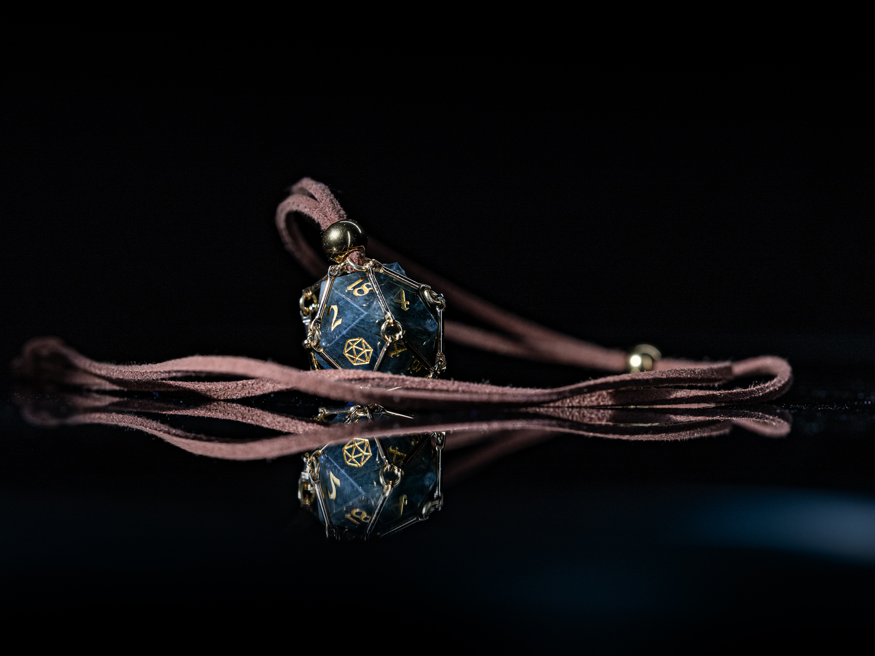 Diese Kette vereint Eleganz mit der mutigen Selbstbestimmtheit eines echten Abenteurers. Ein vergoldeter Würfelkäfig birgt einen W20 aus echtem Edelstein, gehalten von einem markanten Band aus PU-Leder.